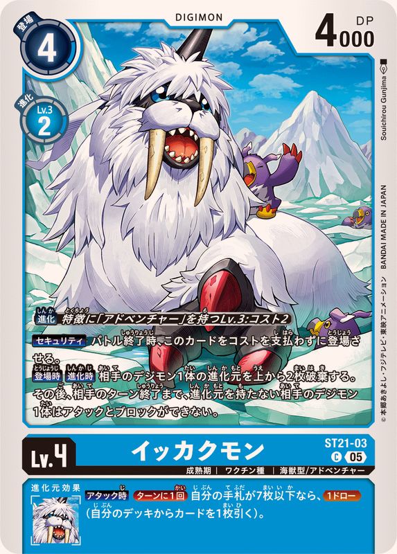 〔進化〕特徴に「アドベンチャー」を持つLv.3:コスト2【セキュリティ】バトル終了時、このカードをコストを支払わずに登場させる。【登場時】【進化時】相手のデジモン1体の進化元を上から2枚破棄する。その後、相手のターン終了まで、進化元を持たない相手のデジモン1体はアタックとブロックができない。【アタック時】[ターンに1回]自分の手札が7枚以下なら、≪1ドロー≫(自分のデッキからカードを1枚引く)。