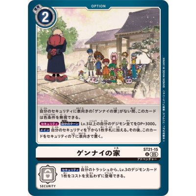 自分のセキュリティに表向きの「ゲンナイの家」がない間、このカードは色条件を無視できる。{セキュリティ}【自分のターン】Lv.3以上の自分のデジモン全てをDP+3000。【メイン】自分のセキュリティを下から1枚手札に加える。その後、このカードをセキュリティの下に表向きで置く。【セキュリティ】自分のトラッシュから、Lv.3のデジモンカード1枚をコストを支払わずに登場できる。