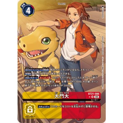 【自分のメインフェイズ開始時】相手のデジモンがいるなら、メモリー+1。【登場時】自分の「大門大」1体をレストできる。【お互いのターン】[ターンに1回]このテイマーがレストしたとき、ターン終了まで、自分のデジモン1体は≪貫通≫を得て、DP+3000。その後、ターン終了まで、相手のデジモン1体をDP-3000。【セキュリティ】このカードをコストを支払わずに登場させる。