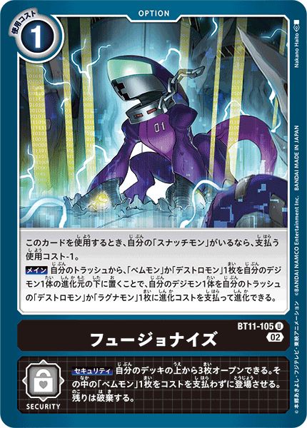 このカードを使用するとき、自分の「スナッチモン」がいるなら、支払う使用コスト-1。【メイン】自分のトラッシュから、「ベムモン」か「デストロモン」1枚を自分のデジモン1体の進化元の下に置くことで、自分のデジモン1体を自分のトラッシュの「デストロモン」か「ラグナモン」1枚に進化コストを支払って進化できる。