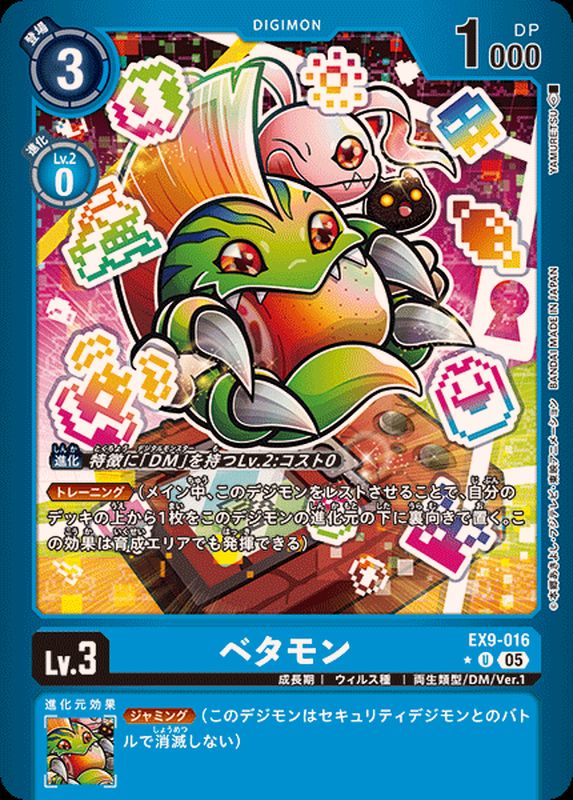 〔進化〕特徴に「DM」を持つLv.2:コスト0≪トレーニング≫(メイン中、このデジモンをレストさせることで、自分のデッキの上から1枚をこのデジモンの進化元の下に裏向きで置く。この効果は育成エリアでも発揮できる)≪ジャミング≫(このデジモンはセキュリティデジモンとのバトルで消滅しない)