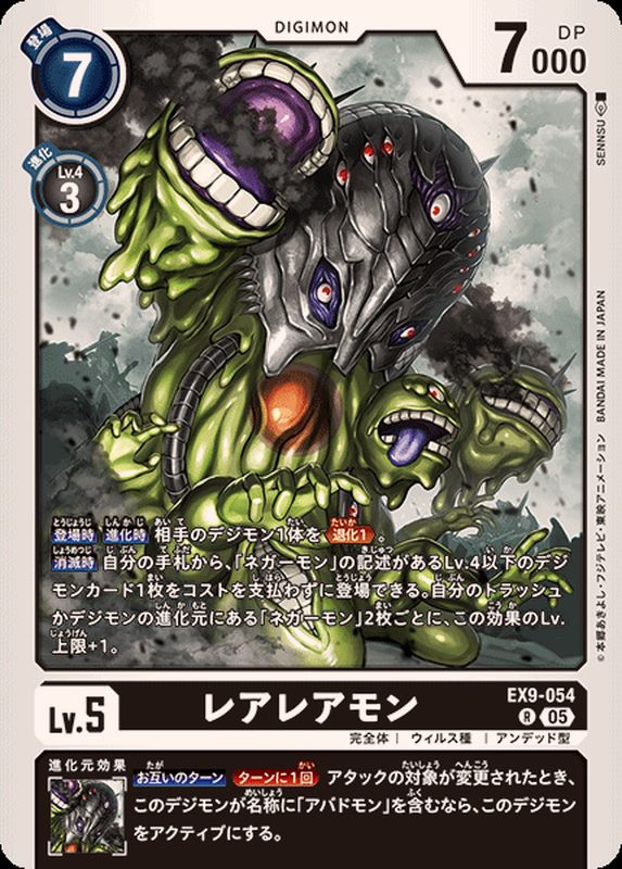 【登場時】【進化時】相手のデジモン1体を≪退化1≫。【消滅時】自分の手札から、「ネガーモン」の記述があるLv.4以下のデジモンカード1枚をコストを支払わずに登場できる。自分のトラッシュかデジモンの進化元にある「ネガーモン」2枚ごとに、この効果のLv.上限+1。【お互いのターン】[ターンに1回]アタックの対象が変更されたとき、このデジモンが名称に「アバドモン」を含むなら、このデジモンをアクティブにする。