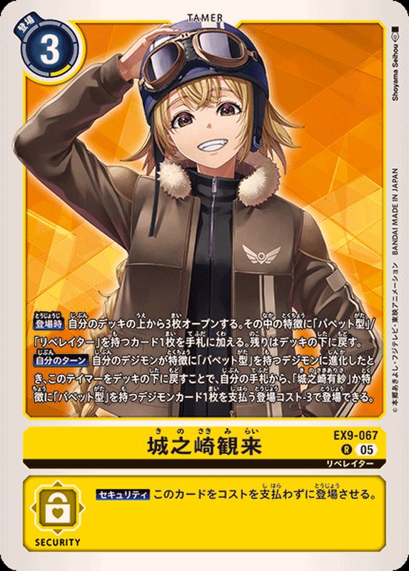 【登場時】自分のデッキの上から3枚オープンする。その中の特徴に「パペット型」/「リベレイター」を持つカード1枚を手札に加える。残りはデッキの下に戻す。【自分のターン】自分のデジモンが特徴に「パペット型」を持つデジモンに進化したとき、このテイマーをデッキの下に戻すことで、自分の手札から、「城之崎有紗」か特徴に「パペット型」を持つデジモンカード1枚を支払う登場コスト-3で登場できる。【セキュリティ】このカードをコストを支払わずに登場させる。