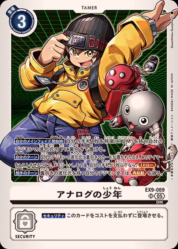 【自分のメインフェイズ開始時】自分の手札1枚を特徴に「DM」を持つ自分のデジモンの進化元の下に裏向きで置ける。【自分のターン】自分のデジモンの進化元に裏向きのカードが置かれたとき、このテイマーをレストさせることで、メモリー+1。その後、自分の手札が7枚以下なら、≪1ドロー≫。【相手のターン】裏向きの進化元を持つ自分のデジモン全ては≪再起動≫を得る。【セキュリティ】このカードをコストを支払わずに登場させる。