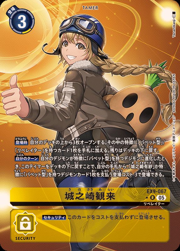 【登場時】自分のデッキの上から3枚オープンする。その中の特徴に「パペット型」/「リベレイター」を持つカード1枚を手札に加える。残りはデッキの下に戻す。【自分のターン】自分のデジモンが特徴に「パペット型」を持つデジモンに進化したとき、このテイマーをデッキの下に戻すことで、自分の手札から、「城之崎有紗」か特徴に「パペット型」を持つデジモンカード1枚を支払う登場コスト-3で登場できる。【セキュリティ】このカードをコストを支払わずに登場させる。