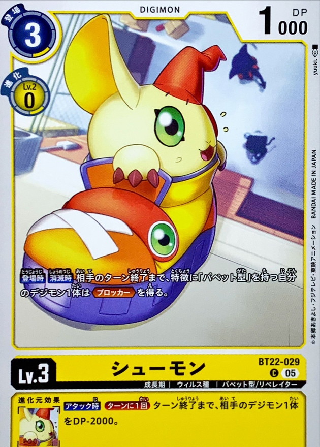 【登場時】【消滅時】相手のターン終了まで、特徴に「パペット型」を持つ自分のデジモン1体は≪ブロッカー≫を得る。【アタック時】[ターンに1回]ターン終了まで、相手のデジモン1体をDP-2000。