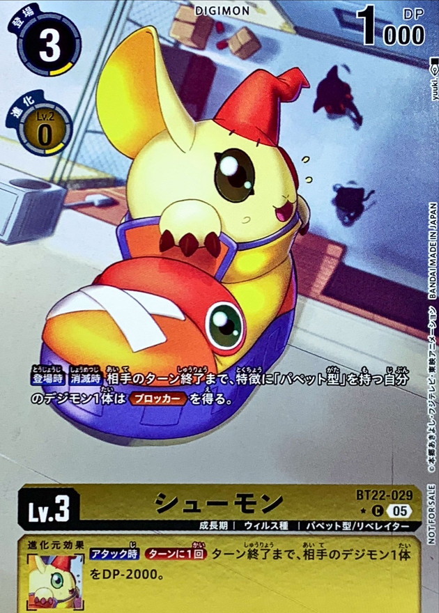 【登場時】【消滅時】相手のターン終了まで、特徴に「パペット型」を持つ自分のデジモン1体は≪ブロッカー≫を得る。【アタック時】[ターンに1回]ターン終了まで、相手のデジモン1体をDP-2000。