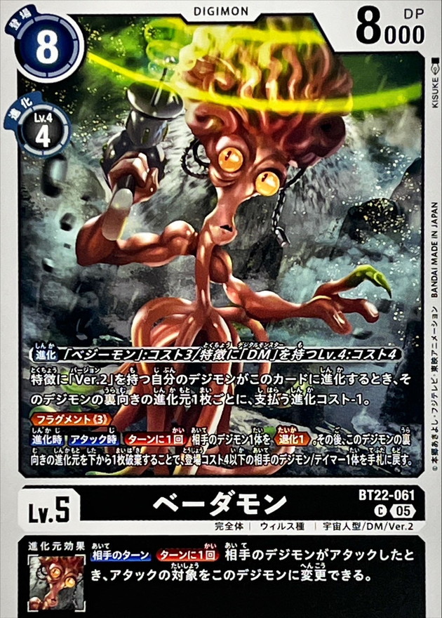 〔進化〕「ベジーモン」:コスト3/特徴に「DM」を持つLv.4:コスト4特徴に「Ver.2」を持つ自分のデジモンがこのカードに進化するとき、そのデジモンの裏向きの進化元1枚ごとに、支払う進化コスト-1。≪フラグメント《3》≫【進化時】【アタック時】[ターンに1回]相手のデジモン1体を≪退化1≫。その後、このデジモンの裏向きの進化元を下から1枚破棄することで、登場コスト4以下の相手のデジモン/テイマー1体を手札に戻す。【相手のターン】[ターンに1回]相手のデジモンがアタックしたとき、アタックの対象をこのデジモンに変更できる。