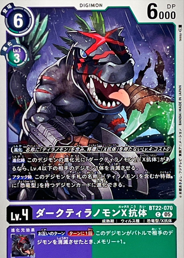 〔進化〕名称に「ティラノモン」を含み、特徴に「X抗体」を持たないLv.4:コスト0【進化時】このデジモンの進化元に「ダークティラノモン」/「X抗体」があるなら、Lv.4以下の相手のデジモン1体を消滅させる。【アタック時】このデジモンを手札の名称に「ティラノモン」を含むか特徴に「恐竜型」を持つデジモンカードに進化できる。【お互いのターン】[ターンに1回]このデジモンがバトルで相手のデジモンを消滅させたとき、メモリー+1。