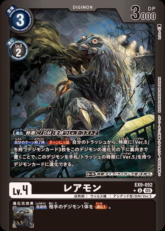 〔進化〕特徴に「DM」を持つLv.3:コスト2【自分のターン終了時】[ターンに1回]自分のトラッシュから、特徴に「Ver.5」を持つデジモンカード3枚をこのデジモンの進化元の下に裏向きで置くことで、このデジモンを手札/トラッシュの特徴に「Ver.5」を持つデジモンカードに進化できる。〈ルール〉特徴:タイプ「サイボーグ型」を持つ。【消滅時】相手のデジモン1体を≪退化1≫。