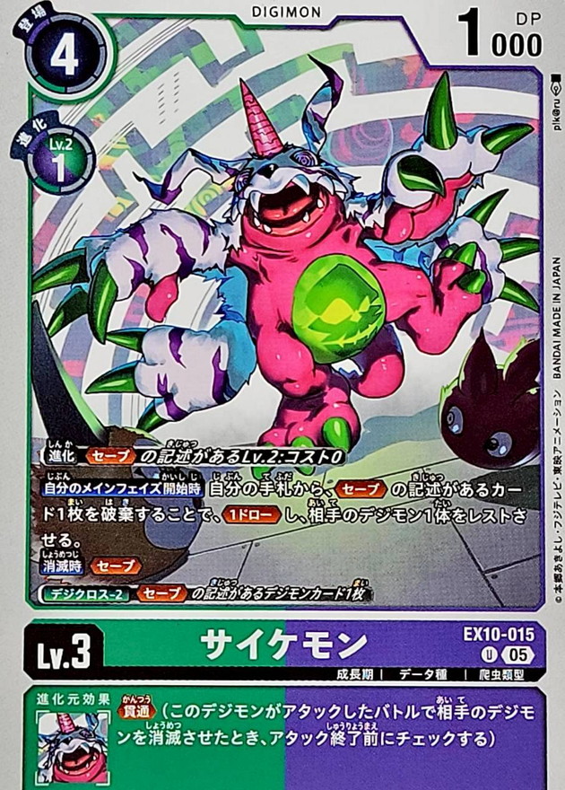 〔進化〕≪セーブ≫の記述があるLv.2:コスト0【自分のメインフェイズ開始時】自分の手札から、≪セーブ≫の記述があるカード1枚を破棄することで、≪1ドロー≫し、相手のデジモン1体をレストさせる。【消滅時】≪セーブ≫デジクロス-2:≪セーブ≫の記述があるデジモンカード1枚≪貫通≫(このデジモンがアタックしたバトルで相手のデジモンを消滅させたとき、アタック終了前にチェックする)