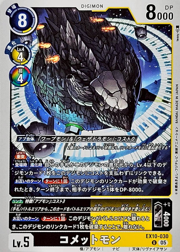 〔アプ合体〕「ワープモン」&「ウェザドラモン」:コスト02種のカードによるリンク状態なら、リンクカードを上に重ね進化する≪衝突≫【登場時】【進化時】自分の手札かこのデジモンの進化元から、Lv.4以下のデジモンカード1枚をこのデジモンにコストを支払わずにリンクできる。【お互いのターン】[ターンに1回]このデジモンのリンクカードが効果で破棄されたとき、ターン終了まで、相手のデジモン1体をDP-8000。DP+4000〈リンク〉特徴「アプモン」:コスト3(手札/バトルエリアから、このカードをバトルエリアの指定のデジモンに横向きで差し込む)【お互いのターン】[ターンに1回]このデジモンがバトルエリアを離れるとき、このデジモンのリンクカード1枚を破棄することで、離れない。