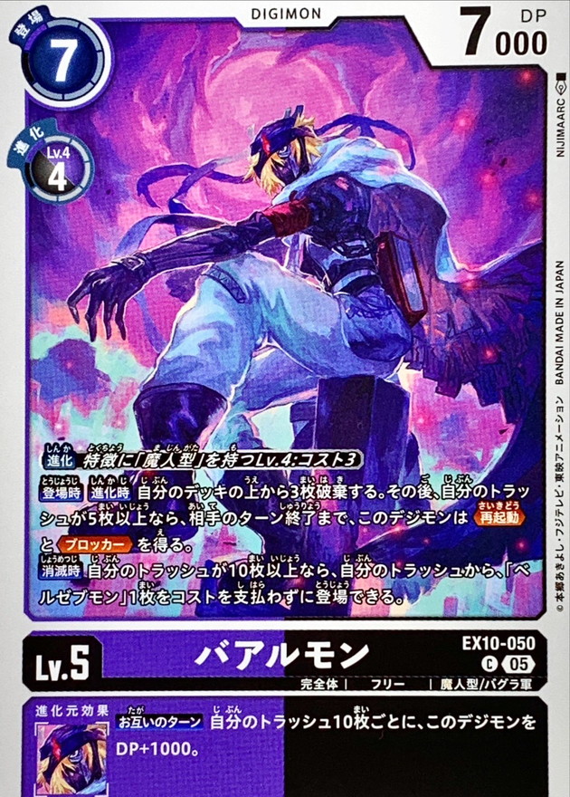 〔進化〕特徴に「魔人型」を持つLv.4:コスト3【登場時】【進化時】自分のデッキの上から3枚破棄する。その後、自分のトラッシュが5枚以上なら、相手のターン終了まで、このデジモンは≪再起動≫と≪ブロッカー≫を得る。【消滅時】自分のトラッシュが10枚以上なら、自分のトラッシュから、「ベルゼブモン」1枚をコストを支払わずに登場できる。【お互いのターン】自分のトラッシュ10枚ごとに、このデジモンをDP+1000。