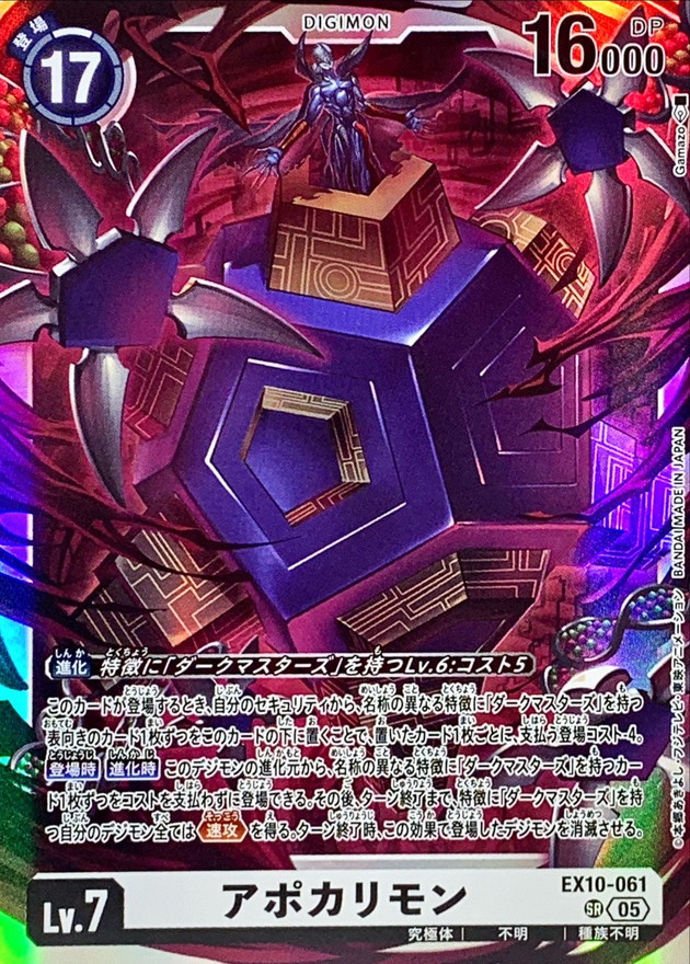 〔進化〕特徴に「ダークマスターズ」を持つLv.6:コスト5このカードが登場するとき、自分のセキュリティから、名称の異なる特徴に「ダークマスターズ」を持つ表向きのカード1枚ずつをこのカードの下に置くことで、置いたカード1枚ごとに、支払う登場コスト-4。【登場時】【進化時】このデジモンの進化元から、名称の異なる特徴に「ダークマスターズ」を持つカード1枚ずつをコストを支払わずに登場できる。その後、ターン終了まで、特徴に「ダークマスターズ」を持つ自分のデジモン全ては≪速攻≫を得る。ターン終了時、この効果で登場したデジモンを消滅させる。