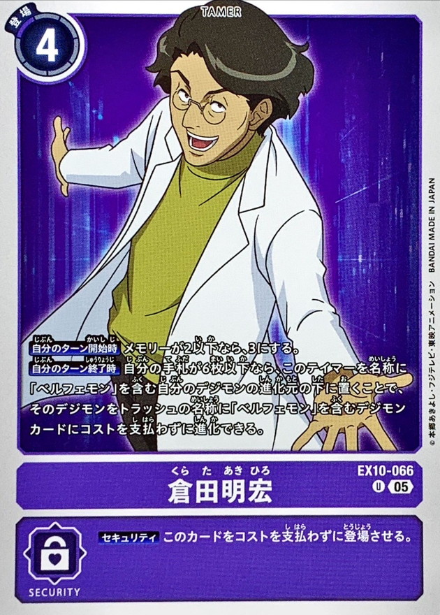 【自分のターン開始時】メモリーが2以下なら、3にする。【自分のターン終了時】自分の手札が6枚以下なら、このテイマーを名称に「ベルフェモン」を含む自分のデジモンの進化元の下に置くことで、そのデジモンをトラッシュの名称に「ベルフェモン」を含むデジモンカードにコストを支払わずに進化できる。【セキュリティ】このカードをコストを支払わずに登場させる。