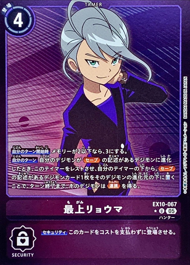 【自分のターン開始時】メモリーが2以下なら、3にする。【自分のターン】自分のデジモンが≪セーブ≫の記述があるデジモンに進化したとき、このテイマーをレストさせ、自分のテイマーの下から、≪セーブ≫の記述があるデジモンカード1枚をそのデジモンの進化元の下に置くことで、ターン終了まで、そのデジモンは≪連携≫を得る。【セキュリティ】このカードをコストを支払わずに登場させる。