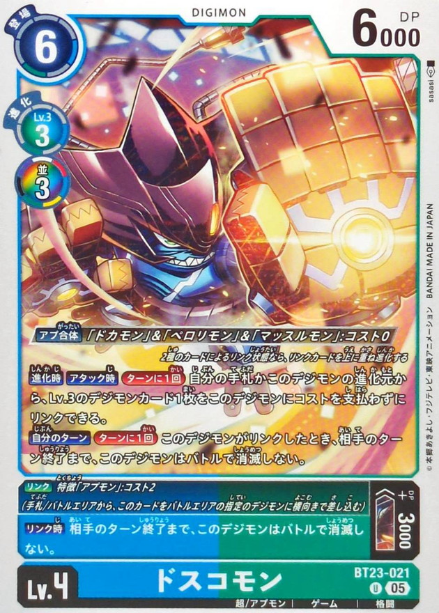 〔アプ合体〕「ドカモン」&「ペロリモン」&「マッスルモン」:コスト02種のカードによるリンク状態なら、リンクカードを上に重ね進化する【進化時】【アタック時】[ターンに1回]自分の手札かこのデジモンの進化元から、Lv.3のデジモンカード1枚をこのデジモンにコストを支払わずにリンクできる。【自分のターン】[ターンに1回]このデジモンがリンクしたとき、相手のターン終了まで、このデジモンはバトルで消滅しない。DP+3000〈リンク〉特徴「アプモン」:コスト2(手札/バトルエリアから、このカードをバトルエリアの指定のデジモンに横向きで差し込む)【リンク時】相手のターン終了まで、このデジモンはバトルで消滅しない。