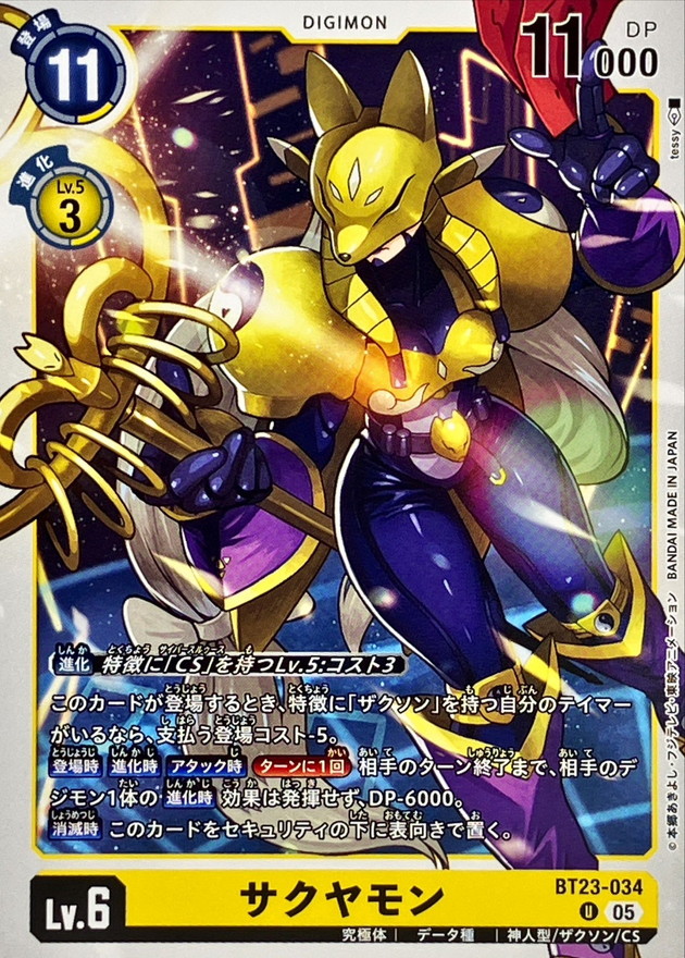 〔進化〕特徴に「CS」を持つLv.5:コスト3このカードが登場するとき、特徴に「ザクソン」を持つ自分のテイマーがいるなら、支払う登場コスト-5。【登場時】【進化時】【アタック時】[ターンに1回]相手のターン終了まで、相手のデジモン1体の【進化時】効果は発揮せず、DP-6000。【消滅時】このカードをセキュリティの下に表向きで置く。