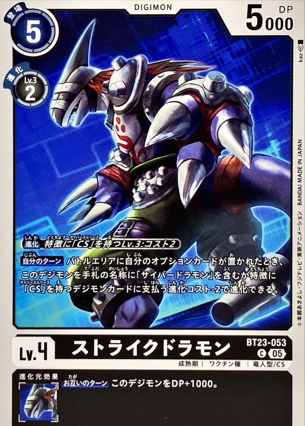 〔進化〕特徴に「CS」を持つLv.3:コスト2【自分のターン】バトルエリアに自分のオプションカードが置かれたとき、このデジモンを手札の名称に「サイバードラモン」を含むか特徴に「CS」を持つデジモンカードに支払う進化コスト-2で進化できる。【お互いのターン】このデジモンをDP+1000。
