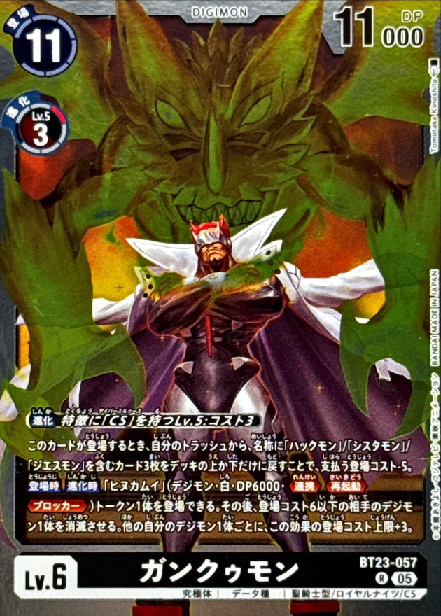 〔進化〕特徴に「CS」を持つLv.5:コスト3このカードが登場するとき、自分のトラッシュから、名称に「ハックモン」/「シスタモン」/「ジエスモン」を含むカード3枚をデッキの上か下だけに戻すことで、支払う登場コスト-5。【登場時】【進化時】「ヒヌカムイ」(デジモン・白・DP6000・≪連携≫≪再起動≫≪ブロッカー≫)トークン1体を登場できる。その後、登場コスト6以下の相手のデジモン1体を消滅させる。他の自分のデジモン1体ごとに、この効果の登場コスト上限+3。