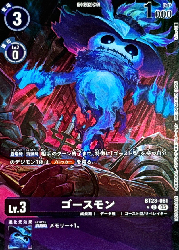 【登場時】【消滅時】相手のターン終了まで、特徴に「ゴースト型」を持つ自分のデジモン1体は≪ブロッカー≫を得る。【消滅時】メモリー+1。
