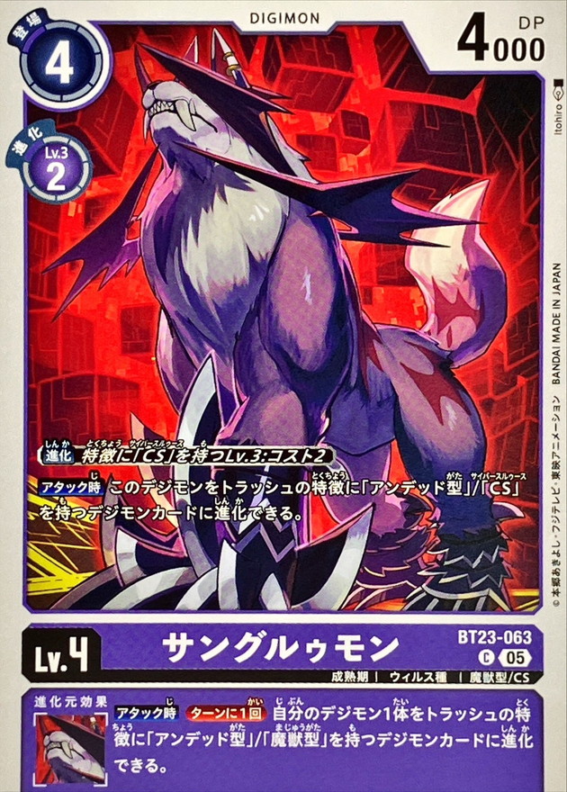 〔進化〕特徴に「CS」を持つLv.3:コスト2【アタック時】このデジモンをトラッシュの特徴に「アンデッド型」/「CS」を持つデジモンカードに進化できる。【アタック時】[ターンに1回]自分のデジモン1体をトラッシュの特徴に「アンデッド型」/「魔獣型」を持つデジモンカードに進化できる。