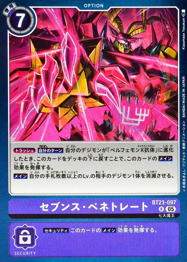{トラッシュ}【自分のターン】自分のデジモンが「ベルフェモンX抗体」に進化したとき、このカードをデッキの下に戻すことで、このカードの【メイン】効果を発揮する。【メイン】自分の手札枚数以上のLv.の相手のデジモン1体を消滅させる。【セキュリティ】このカードの【メイン】効果を発揮する。