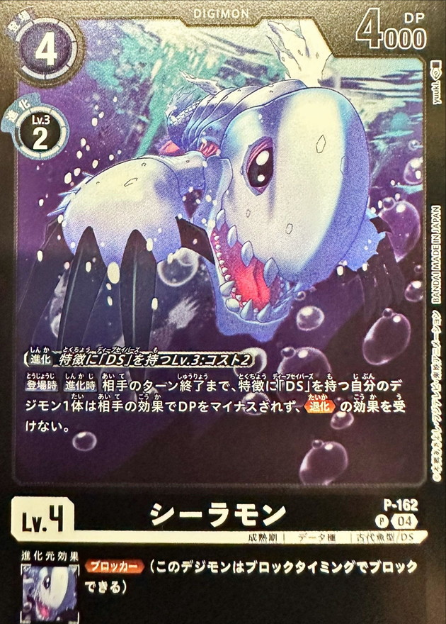【登場時】【進化時】相手のターン終了まで、特徴に「DS」を持つ自分のデジモン1体は相手の効果でDPをマイナスされず、≪退化≫の効果を受けない。