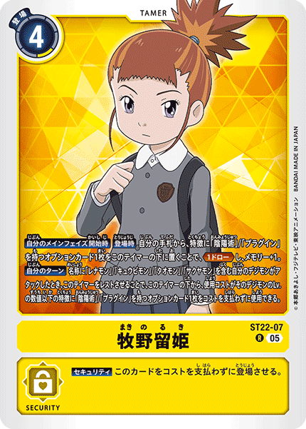 【自分のメインフェイズ開始時】【登場時】自分の手札から、特徴に「陰陽術」/「プラグイン」を持つオプションカード1枚をこのテイマーの下に置くことで、≪1ドロー≫し、メモリー+1。【自分のターン】名称に「レナモン」/「キュウビモン」/「タオモン」/「サクヤモン」を含む自分のデジモンがアタックしたとき、このテイマーをレストさせることで、このテイマーの下から、使用コストがそのデジモンのLv.の数値以下の特徴に「陰陽術」/「プラグイン」を持つオプションカード1枚をコストを支払わずに使用できる。【セキュリティ】このカードをコストを支払わずに登場させる。