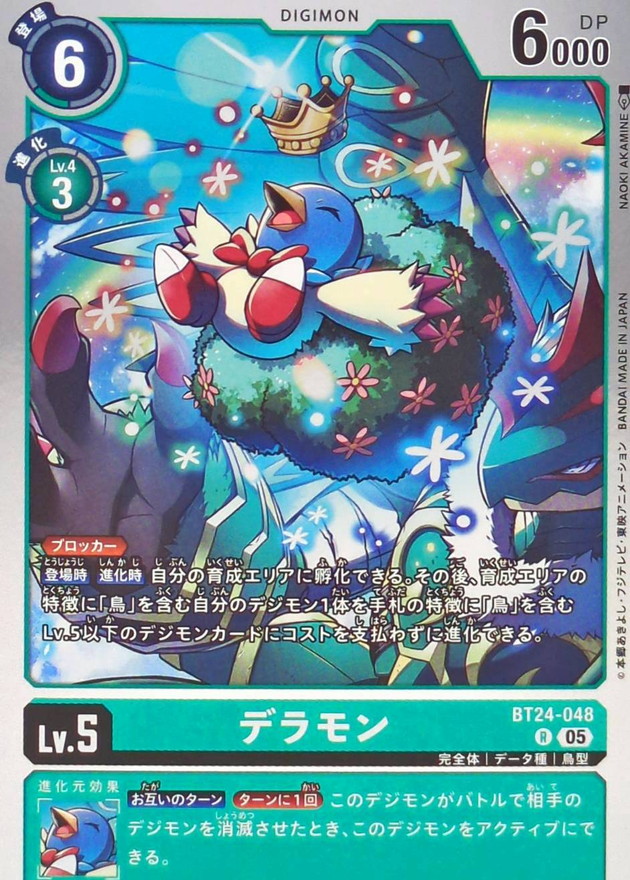 ≪ブロッカー≫【登場時】【進化時】自分の育成エリアに孵化できる。その後、育成エリアの特徴に「鳥」を含む自分のデジモン1体を手札の特徴に「鳥」を含むLv.5以下のデジモンカードにコストを支払わずに進化できる。【お互いのターン】[ターンに1回]このデジモンがバトルで相手のデジモンを消滅させたとき、このデジモンをアクティブにできる。