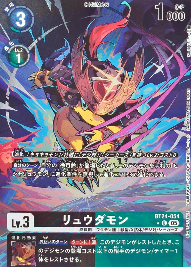 〔進化〕「キョキョモン」/特徴に「デジ対」/「シーカーズ」を持つLv.2:コスト0【自分のターン】自分の「徐月鈴」が登場したとき、このデジモンを手札の「ヒシャリュウモン」に進化条件を無視して進化コスト3で進化できる。【お互いのターン】[ターンに1回]このデジモンがレストしたとき、このデジモンの登場コスト以下の相手のデジモン/テイマー1体をレストさせる。
