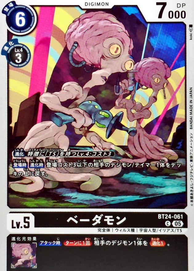 〔進化〕特徴に「TS」を持つLv.4:コスト3【登場時】【進化時】登場コスト3以下の相手のデジモン/テイマー1体をデッキの上に戻す。【アタック時】[ターンに1回]相手のデジモン1体を≪退化1≫。