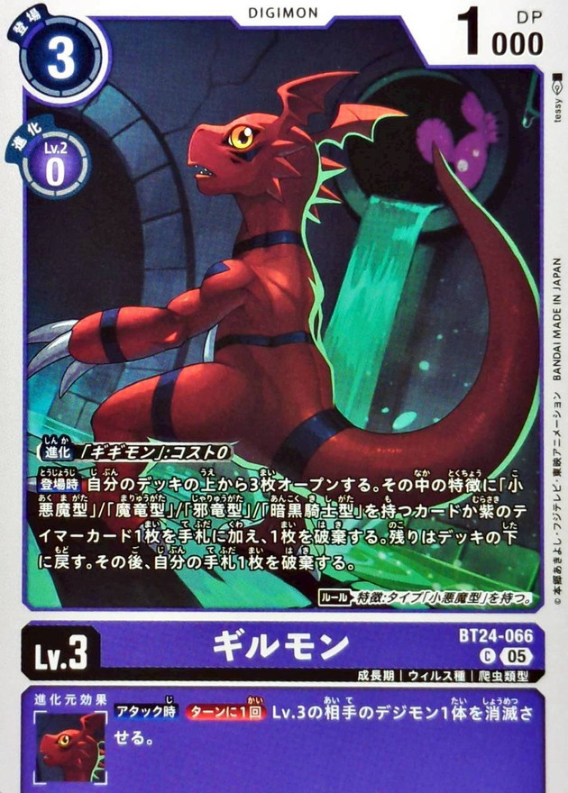 〔進化〕「ギギモン」:コスト0【登場時】自分のデッキの上から3枚オープンする。その中の特徴に「小悪魔型」/「魔竜型」/「邪竜型」/「暗黒騎士型」を持つカードか紫のテイマーカード1枚を手札に加え、1枚を破棄する。残りはデッキの下に戻す。その後、自分の手札1枚を破棄する。〈ルール〉特徴:タイプ「小悪魔型」を持つ。【アタック時】[ターンに1回]Lv.3の相手のデジモン1体を消滅させる。