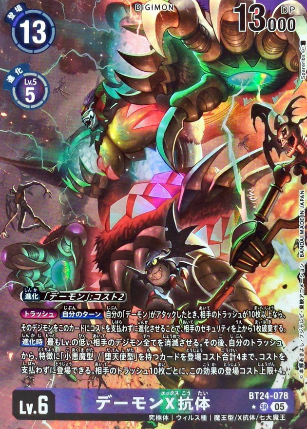 〔進化〕「デーモン」:コスト2{トラッシュ}【自分のターン】自分の「デーモン」がアタックしたとき、相手のトラッシュが10枚以上なら、そのデジモンをこのカードにコストを支払わずに進化させることで、相手のセキュリティを上から1枚破棄する。【進化時】最もLv.の低い相手のデジモン全てを消滅させる。その後、自分のトラッシュから、特徴に「小悪魔型」/「堕天使型」を持つカードを登場コスト合計4まで、コストを支払わずに登場できる。相手のトラッシュ10枚ごとに、この効果の登場コスト上限+4。