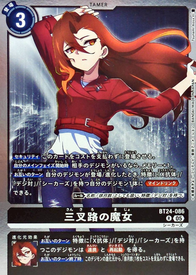 【セキュリティ】このカードをコストを支払わずに登場させる。【自分のメインフェイズ開始時】相手のデジモンがいるなら、メモリー+1。【お互いのターン】自分のデジモンが登場/進化したとき、特徴に「X抗体」/「デジ対」/「シーカーズ」を持つ自分のデジモン1体に≪マインドリンク≫できる。〈ルール〉名称:「徐月鈴」としても扱い、特徴:「デジ対」を持つ。【お互いのターン】特徴に「X抗体」/「デジ対」/「シーカーズ」を持つこのデジモンは≪連携≫と≪再起動≫を得る。【お互いのターン終了時】このデジモンの進化元から、「徐月鈴」1枚をコストを支払わずに登場できる。
