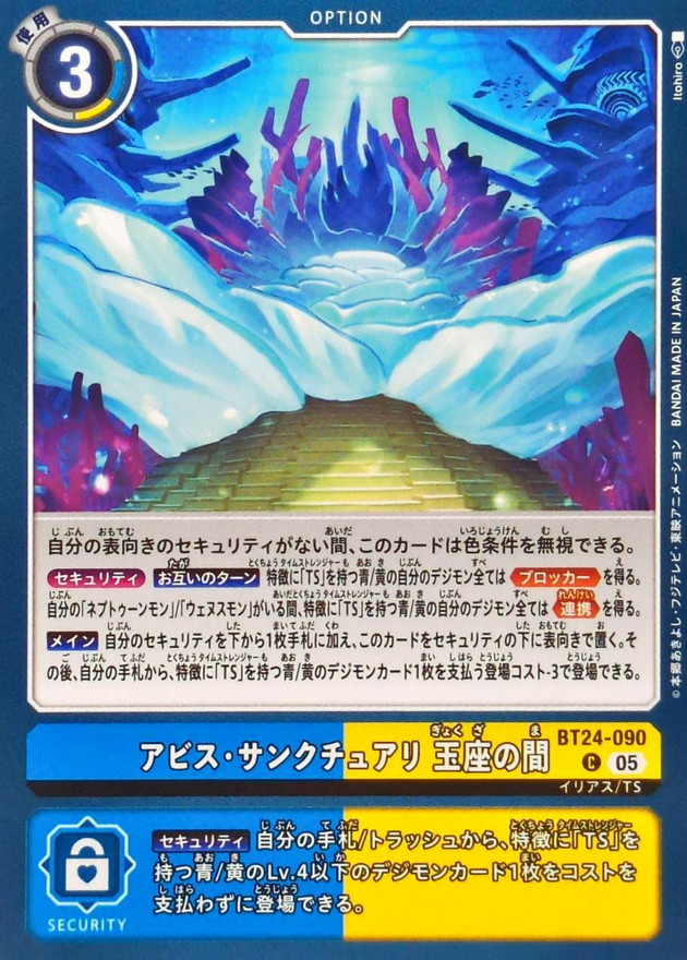 自分の表向きのセキュリティがない間、このカードは色条件を無視できる。{セキュリティ}【お互いのターン】特徴に「TS」を持つ青/黄の自分のデジモン全ては≪ブロッカー≫を得る。自分の「ネプトゥーンモン」/「ウェヌスモン」がいる間、特徴に「TS」を持つ青/黄の自分のデジモン全ては≪連携≫を得る。【メイン】自分のセキュリティを下から1枚手札に加え、このカードをセキュリティの下に表向きで置く。その後、自分の手札から、特徴に「TS」を持つ青/黄のデジモンカード1枚を支払う登場コスト-3で登場できる。【セキュリティ】自分の手札/トラッシュから、特徴に「TS」を持つ青/黄のLv.4以下のデジモンカード1枚をコストを支払わずに登場できる。