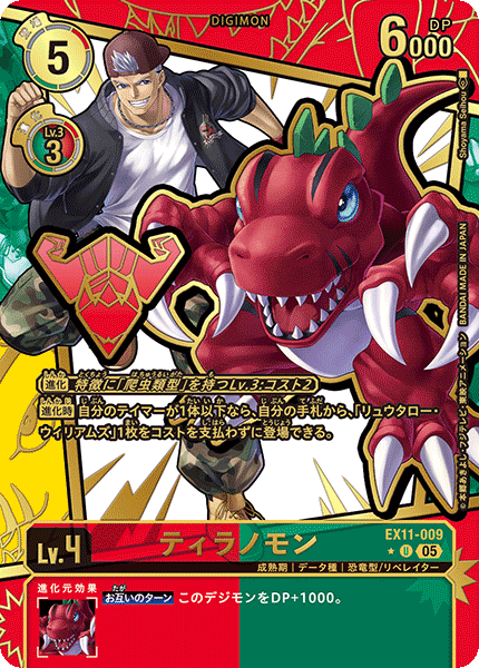 〔進化〕特徴に「爬虫類型」を持つLv.3:コスト2【進化時】自分のテイマーが1体以下なら、自分の手札から、「リュウタロー・ウィリアムズ」1枚をコストを支払わずに登場できる。【お互いのターン】このデジモンをDP+1000。