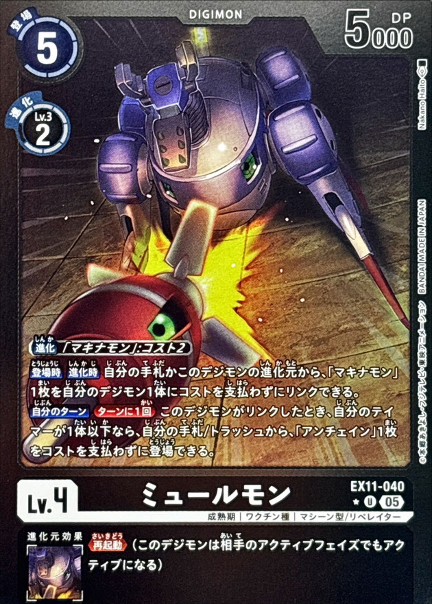 〔進化〕「マキナモン」:コスト2【登場時】【進化時】自分の手札かこのデジモンの進化元から、「マキナモン」1枚を自分のデジモン1体にコストを支払わずにリンクできる。【自分のターン】[ターンに1回]このデジモンがリンクしたとき、自分のテイマーが1体以下なら、自分の手札/トラッシュから、「アンチェイン」1枚をコストを支払わずに登場できる。≪再起動≫(このデジモンは相手のアクティブフェイズでもアクティブになる)