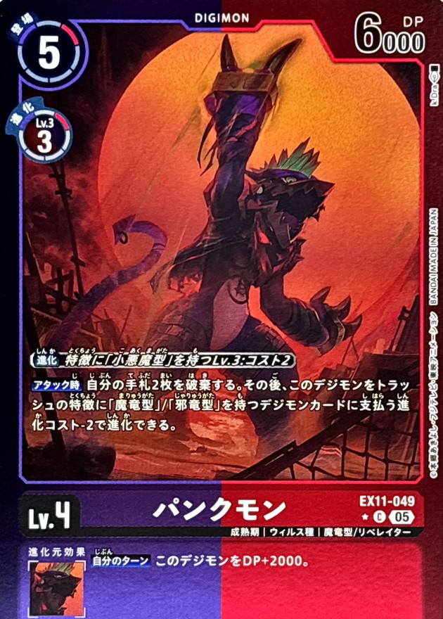〔進化〕特徴に「小悪魔型」を持つLv.3:コスト2【アタック時】自分の手札2枚を破棄する。その後、このデジモンをトラッシュの特徴に「魔竜型」/「邪竜型」を持つデジモンカードに支払う進化コスト-2で進化できる。【自分のターン】このデジモンをDP+2000。