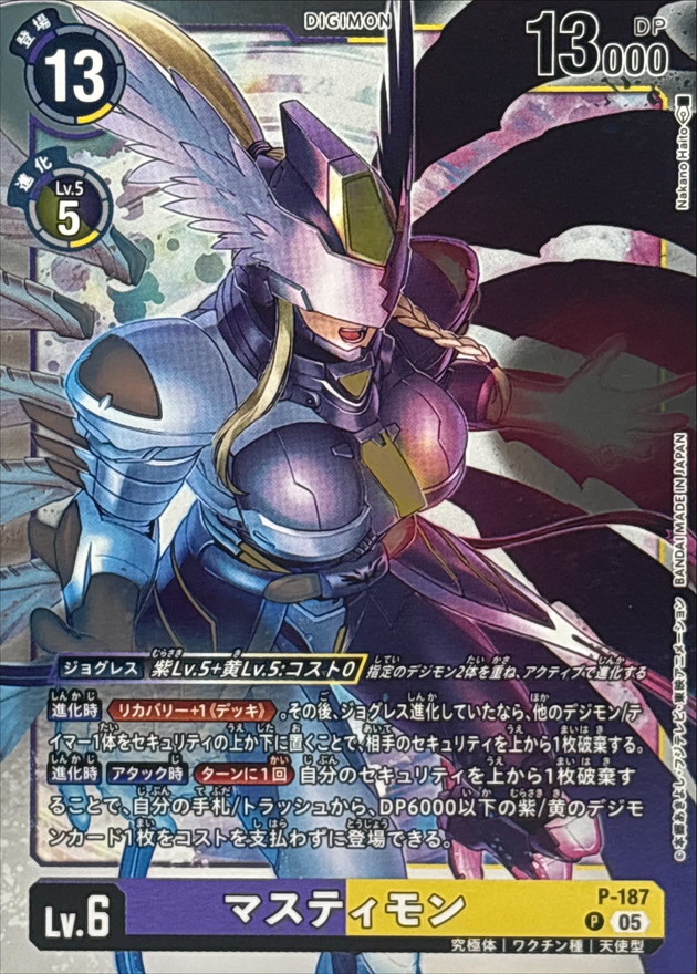 〔ジョグレス〕紫Lv.5+黄Lv.5:コスト0指定のデジモン2体を重ね、アクティブで進化する【進化時】≪リカバリー+1《デッキ》≫。その後、ジョグレス進化していたなら、他のデジモン/テイマー1体をセキュリティの上か下に置くことで、相手のセキュリティを上から1枚破棄する。【進化時】【アタック時】[ターンに1回]自分のセキュリティを上から1枚破棄することで、自分の手札/トラッシュから、DP6000以下の紫/黄のデジモンカード1枚をコストを支払わずに登場できる。