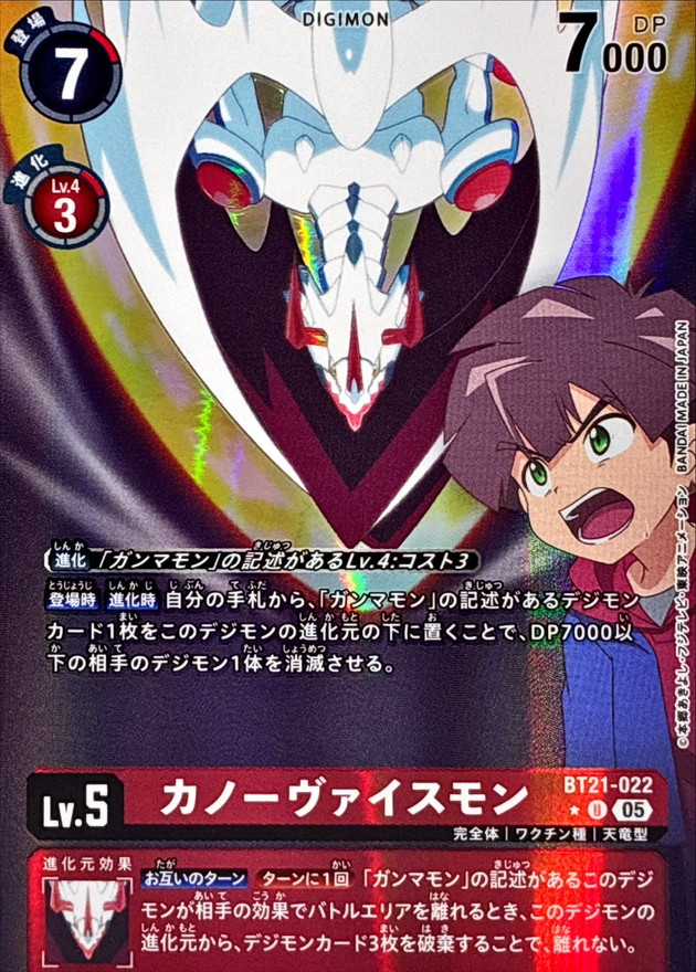〔進化〕「ガンマモン」の記述があるLv.4:コスト3【登場時】【進化時】自分の手札から、「ガンマモン」の記述があるデジモンカード1枚をこのデジモンの進化元の下に置くことで、DP7000以下の相手のデジモン1体を消滅させる。【お互いのターン】[ターンに1回]「ガンマモン」の記述があるこのデジモンが相手の効果でバトルエリアを離れるとき、このデジモンの進化元から、デジモンカード3枚を破棄することで、離れない。