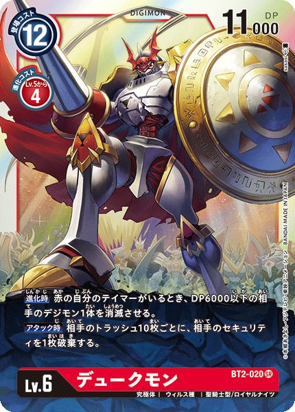 【進化時】赤の自分のテイマーがいるとき、DP6000以下の相手のデジモン1体を消滅させる。【アタック時】相手のトラッシュ10枚ごとに、相手のセキュリティを1枚破棄する。